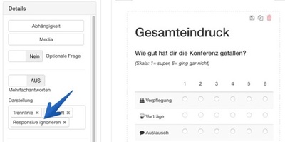 In den Optionen für die "Darstellung" finden sich individuelle Einstellungsmöglichkeiten von Fragen. Hier gibt es für die Matrix nun auch die Einstellung "Responsive ignorieren".
