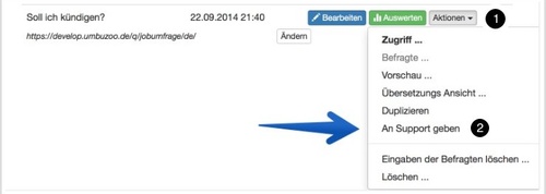 Umfragen können nun an den Umbuzoo Support übergeben werden. Damit können wir noch einfacher und schneller bei Problemen oder Fragen unterstützen.