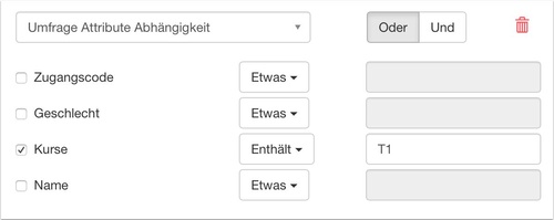 Auf die Nutzerinformationen können Abhängigkeiten gesetzt werden. Zum Beispiel sollten Besucher einer Veranstaltung im Vorfeld zu ihren angemeldeten Vorträgen befragt werden. Über eine Abhängigkeit auf die gebuchten Kurse kann nun z.B, die Frage zum Kurs "T1" nur anzeigt werden, wenn der Befragte diesen Kurs auch gewählt hat: