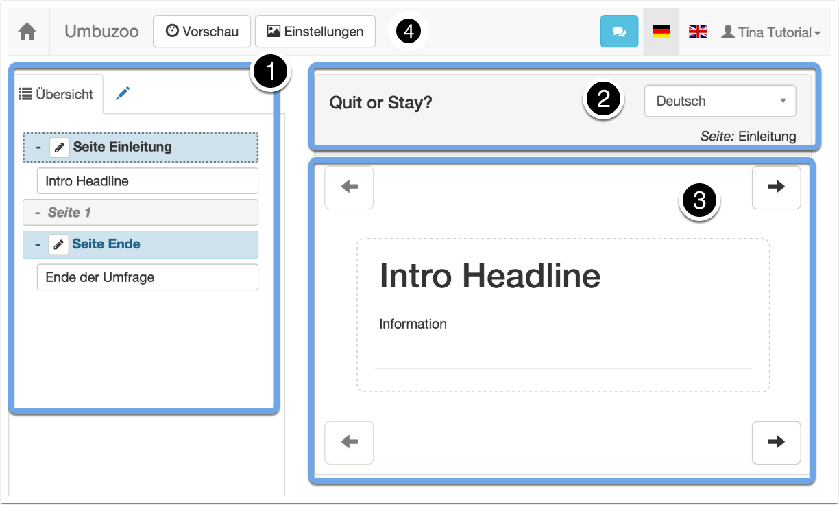 | 3 | Bearbeitung | Hier werden die Inhalte der Umfrage bearbeitet. |