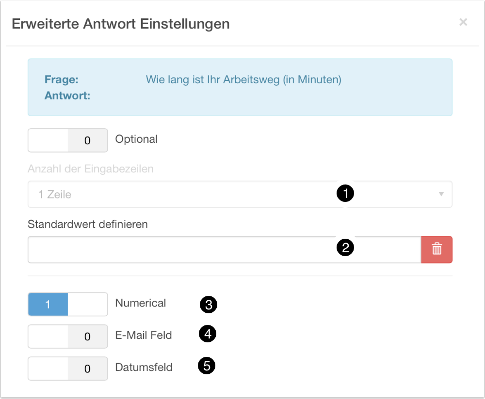 Die Antwortmöglichkeiten von freien Eingaben können über die erweiterten Einstellungen (1) eingeschränkt werden: